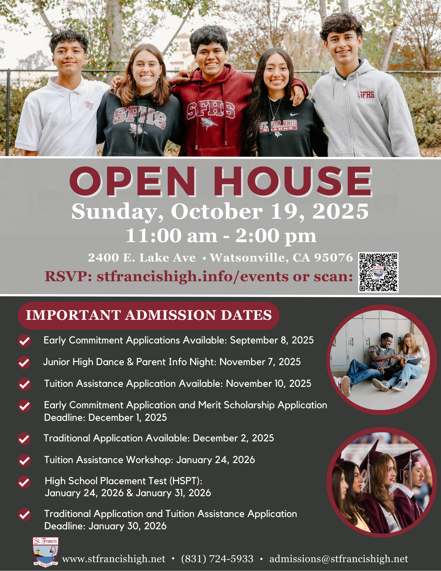 Join Us For Our Open House! Sunday, October 19, 2025 11:00 am - 2:00 pm 2400 E. Lake Ave • Watsonville, CA 95076 RSVP: stfrancishigh.info/events Published October 15, 2025 Print
